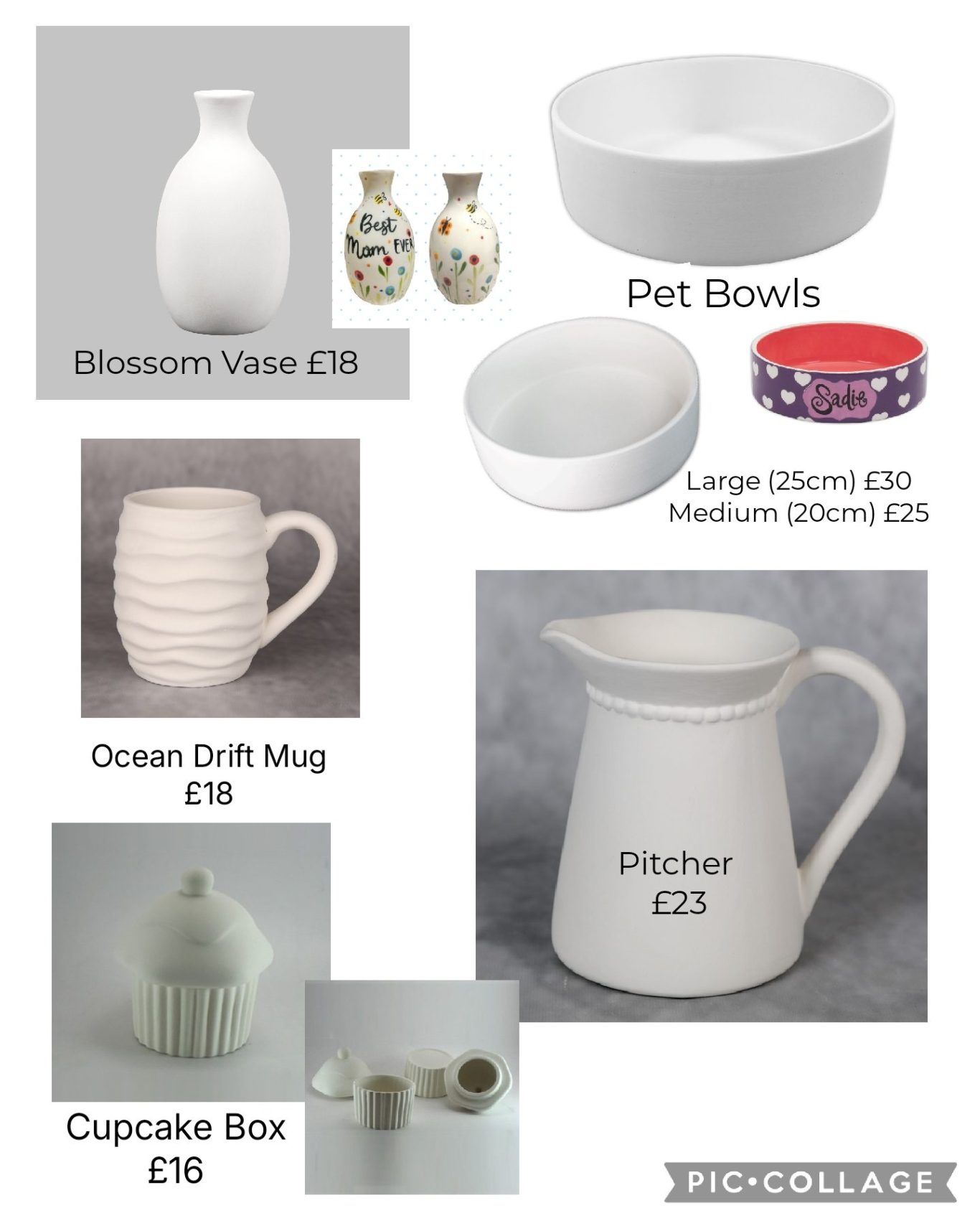 Choose a piece of bisque (a piece of pottery fired once and ready to be glazed) and add your own personal design with a wide range of glazes. Once finished, your piece will then be fired in the kiln and ready to collect from the studio in approximately two weeks.